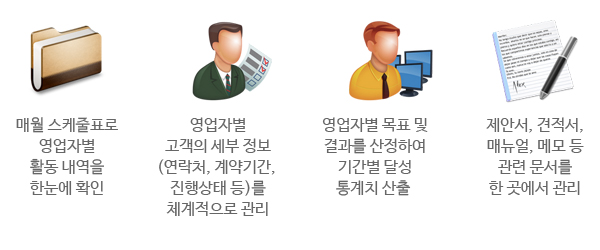영업 관리에 고민이 있다면? 영업의 기본은 본인의 스케쥴 관리 및 할 일에 대한 관리로부터 시작됩니다. 하나하나 체계적인 영업관리를 통해 매출 실적을 높여드리겠습니다.